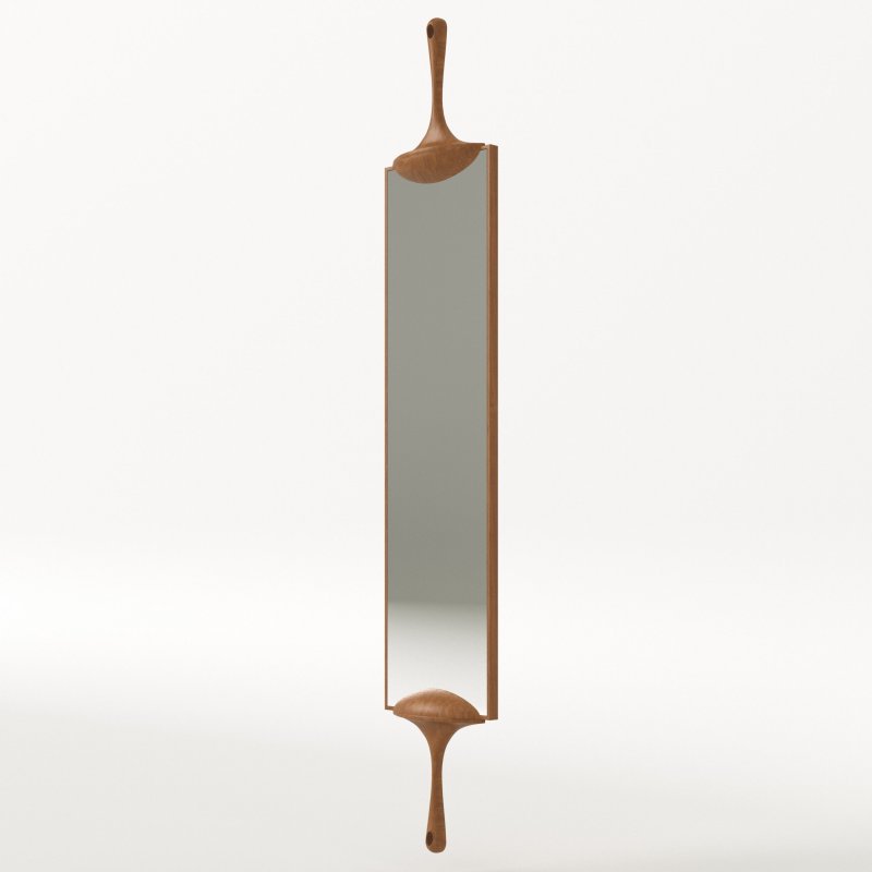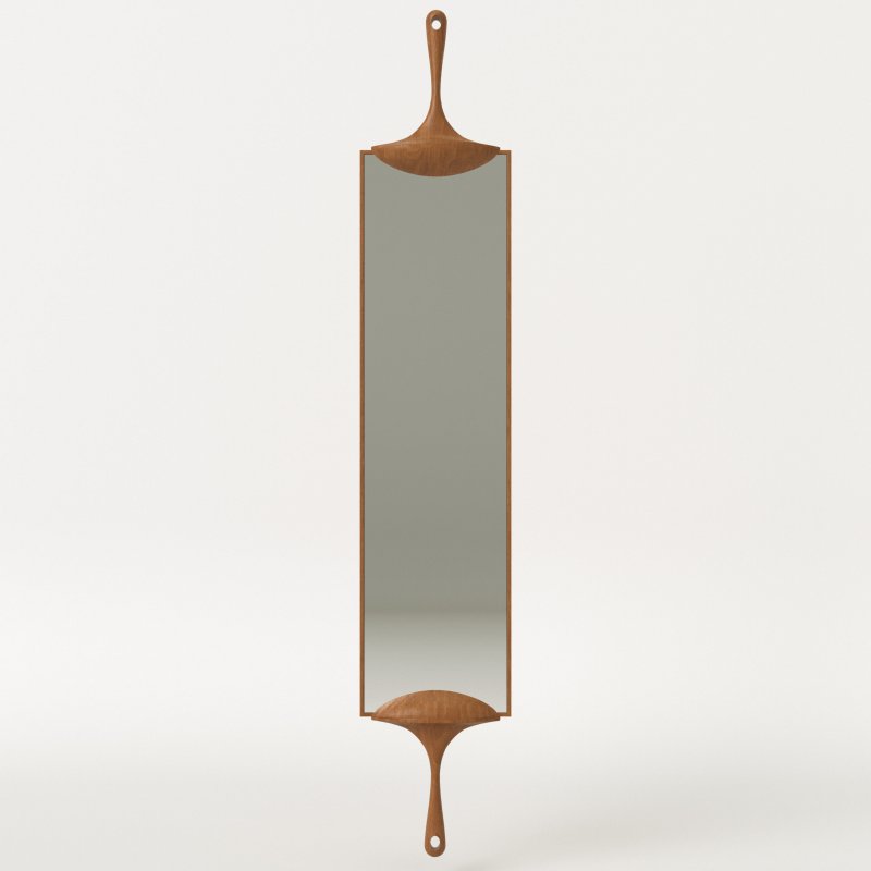 O Espelho Chuva Retangular se destaca pela delicadeza de suas formas e pela poesia presente em seu desenho. Com estrutura em madeira natural e hastes superiores e inferiores que lembram o gesto de segurar uma peça artesanal, ele evoca a sensação de fluidez