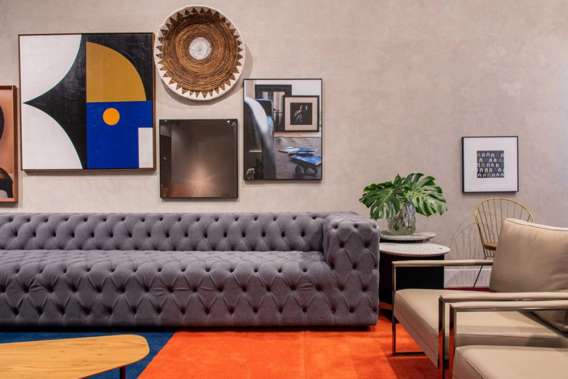 O sofá todo em veludo cinza e capitonê remete ao clássico modelo Chesterfield, porém com uma leitura muito mais leve e moderna. As mesas laterais redondas com base em aço carbono e tampo em granito são assinadas pelo Estúdio 3955 e a mesa de pebolim em madeira teka, aço, acrílico e vidro ganhadora do prêmio A’ Design Award Silver leva a assinatura do estúdio de design Mula Preta.